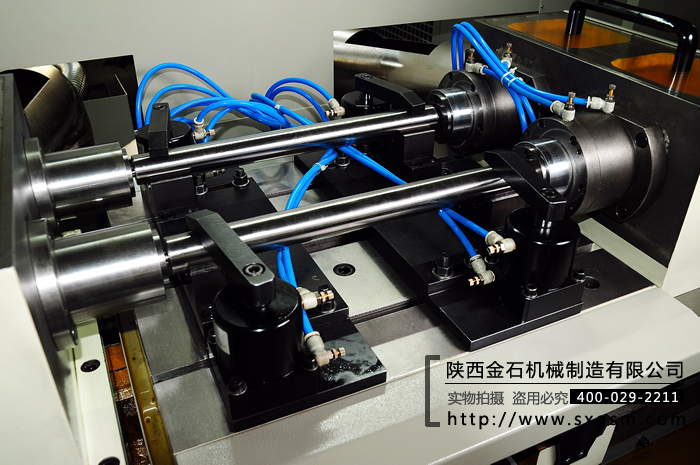導向套:左側導向套軸向固定; 右側導向套氣動驅動伸縮,推動工件貼緊兩導向套