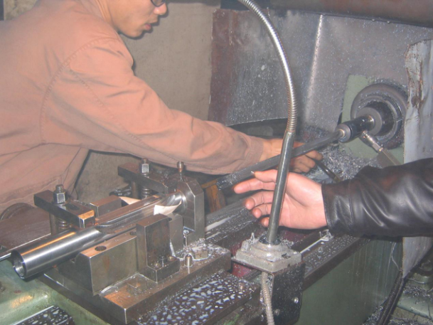 2、根據實際情況設計工裝,將工件固定在機床中托板上。并可以設計導向套安裝在工件前端面,引導深孔鉆進入。此種方法不需在深孔加工前加工引導孔。大大提高了加工效率。改造深孔鉆鏜床刀具的安裝可根據工件的實際情況選擇方式:機床轉速和最小進給量都能滿足加工要求時,旋轉夾具錐柄直接安裝在機床主軸錐孔內,刀具安裝在旋轉夾具,機床主軸通過旋轉夾具帶動刀具作旋轉運動,進給運動由大托板提供。