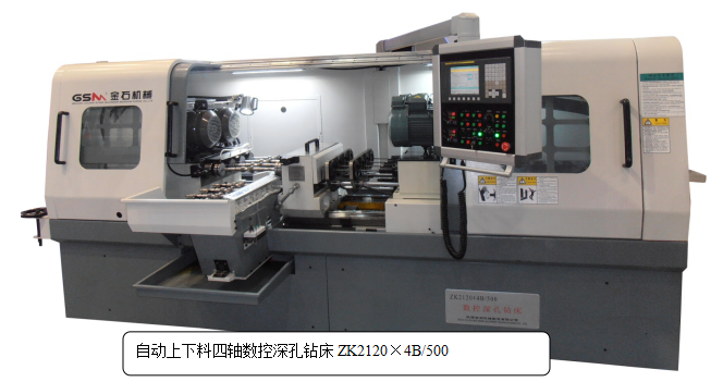 應(yīng)廣大用戶的要求,金石機械在之前制造四軸槍鉆機床的基礎(chǔ)上,針對工件裝卸的不便及費時的缺點,研發(fā)了如下自動上下料的四軸深孔鉆床。大大提高了槍鉆機床的利用率,并降低了操作工人的勞動強度。很快得到廣泛應(yīng)用。