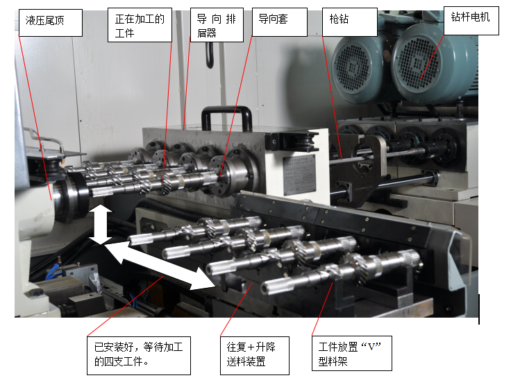 該機床的工件裝卸由人工實施。即人工安裝四支工件在預(yù)定位支架上,機床開始深孔鉆削。加工完成后,機床停止加工,人工將加工好的四支工件取走,再重新安裝上四支新工件。往復(fù)運行。