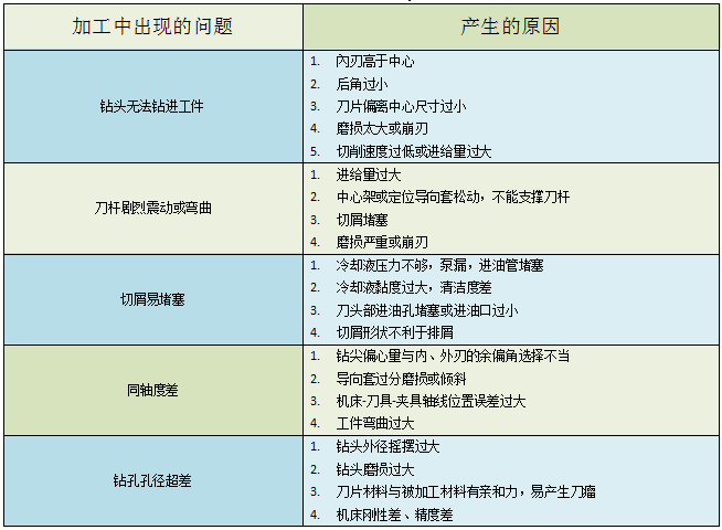 6. 槍鉆加工中常遇到的問題和產(chǎn)生的原因見下表: