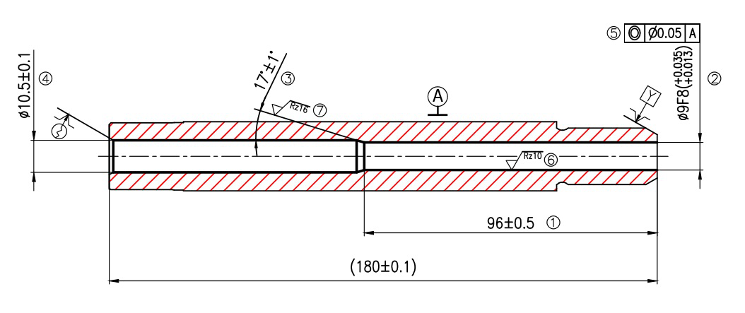 1. φ9F8 (+0.013-0.035),該孔的加工難點在于孔徑公差、孔壁粗糙度和偏斜度的控制。