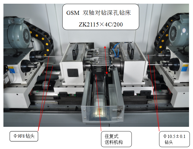 1. 機床結構的選擇:因為φ9f8 (+0.013-0.035)孔徑公差要求非常高,又加之零件為大批量生產,效率要求極高,所以深孔加工過程需要穩定可靠,并且要方便刀具及工裝的調整。所以,機床的主軸數量選擇為2軸。如果選用4軸機床,則同時調整4支高精度的刀具,難度很大,也很難保證加工質量。為了提高加工效率,考慮將左側的φ10.5±0.1深孔與φ9f8 (+0.013-0.035)同時加工。這樣可以保證工件一次裝夾,完成左右兩側孔的加工,大大提高了加工效率,加工效率比通常的四軸機床還要高很多。所以機床選擇為雙軸對鉆深孔鉆床。加工孔徑范圍:φ3~φ15。機床結構參見下圖。